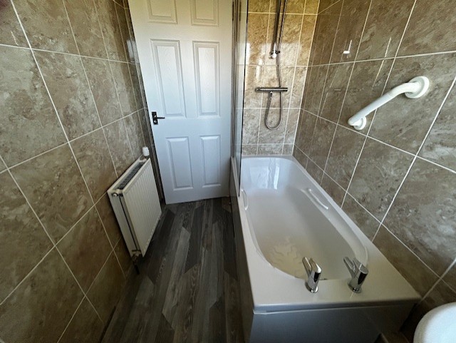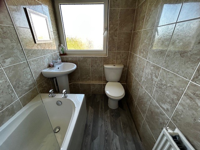 Description: Window Formation to Rear of Property, Features a 3 Piece Suite comprising of an over-bath shower. WC and Wash Hand Basin, Lino floor Covering, Tiled Walls and Wall Mounted Radiator