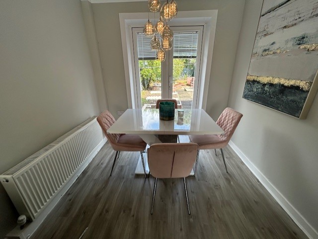 Description: Window Formation with Wooden Venetian Blind to Front of Property, Laminate Floor Covering, Ceiling Light and Power Points, Dining Area with French Doors leading out to Rear Garden