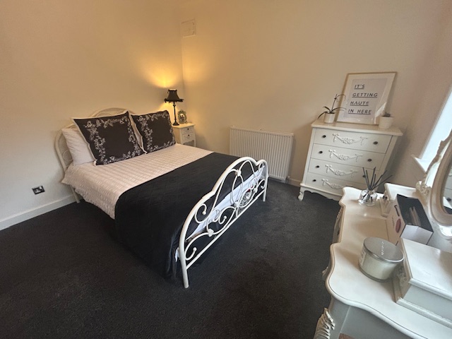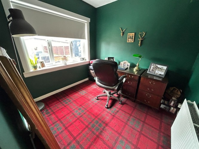 Description: Window Formation onto Rear Decking area, this bedroom is presently being utilised as Home Office, Carpet Floor Covering, Ceiling Light and Power Points, Wall Mounted Radiator,