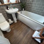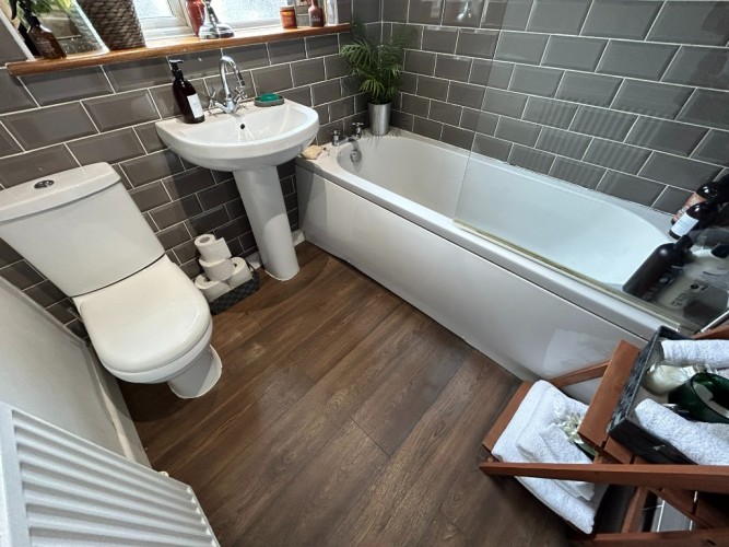 Description: Window Formation to Rear of Property, Featuring 3 Piece Suite, comprising of WC, Wash Hand Basin and Bath, Partially Tiled Walls, Ceiling Light, Tiled Wooden Floor Covering, Wall Mounted Radiator.