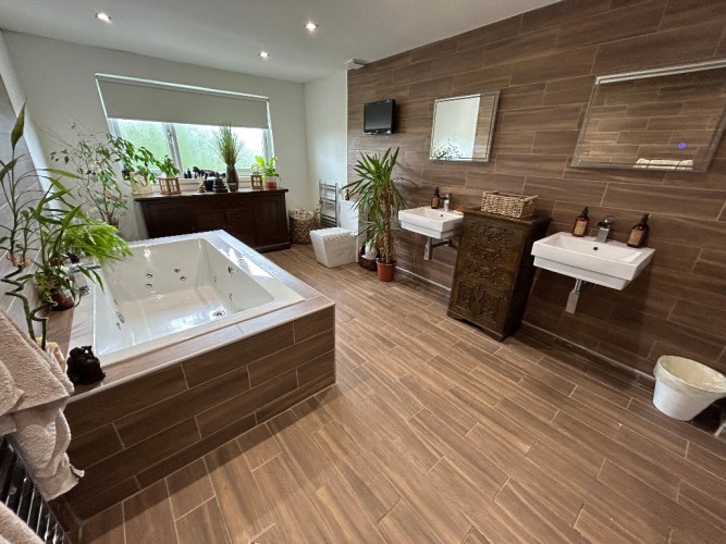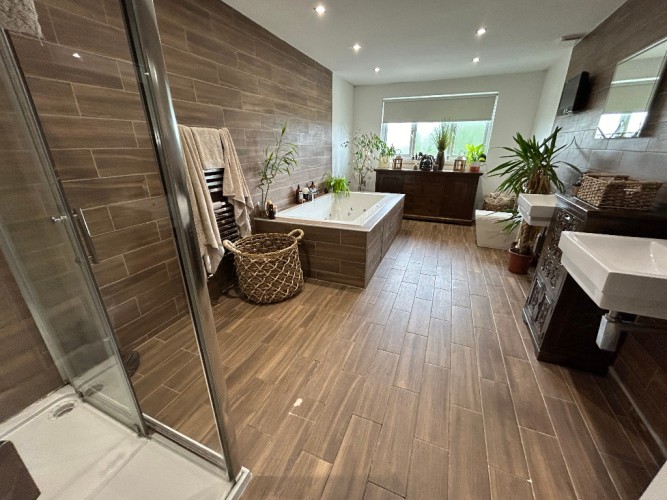 Description: Window formation to rear of Property, Features WC, 2 Wash Hand Basins, Jacuzzi Bath and Free Standing Shower Cubicle With Power Shower, Fully Tiled and Wall Covering, Ceiling light, Wall Mounted Radiator,