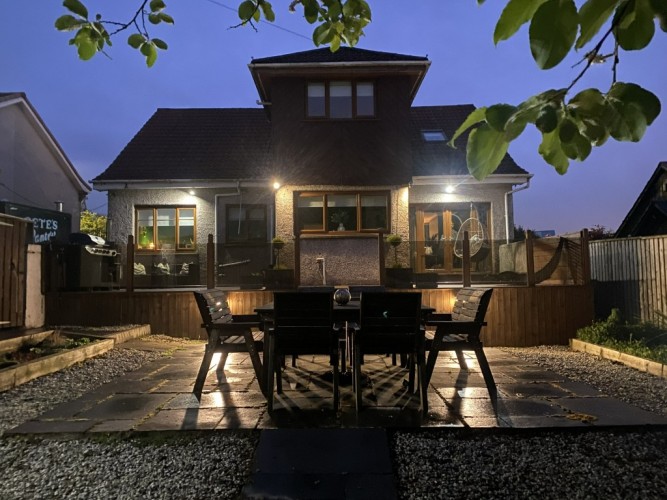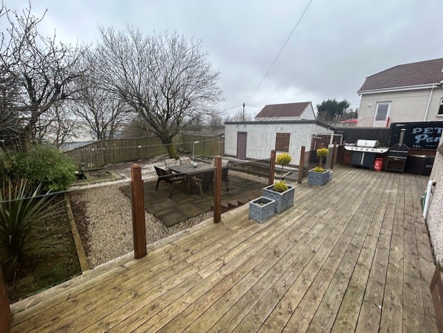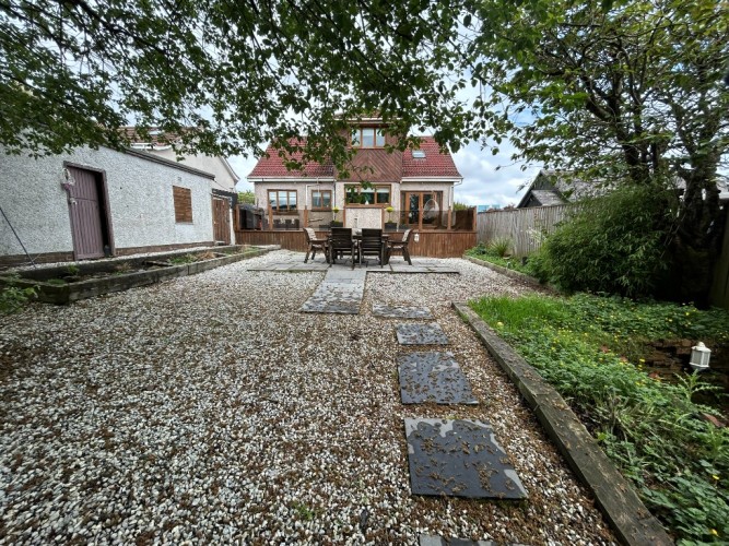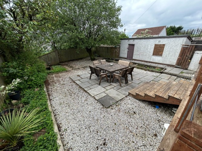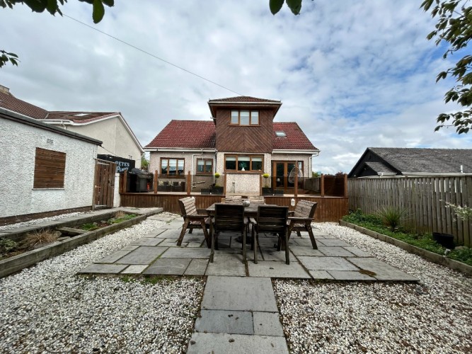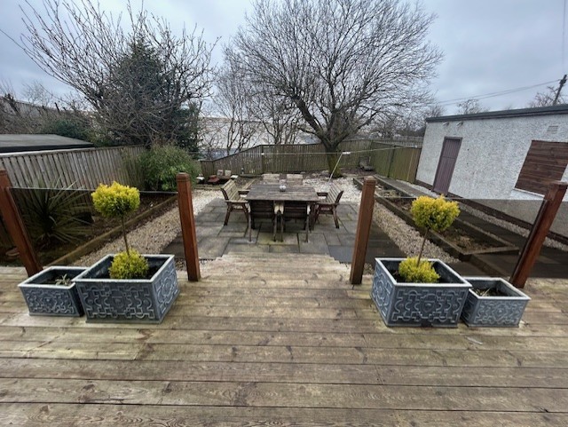 REAR GARDEN: Raised Decking, Low Maintenance, Paved and Chipped, Shrubs and Trees, Perfect for Dining and Hosting gatherings,