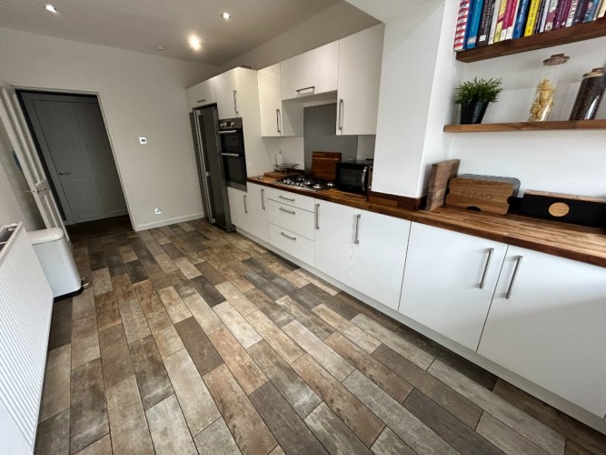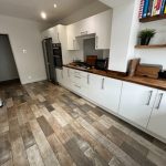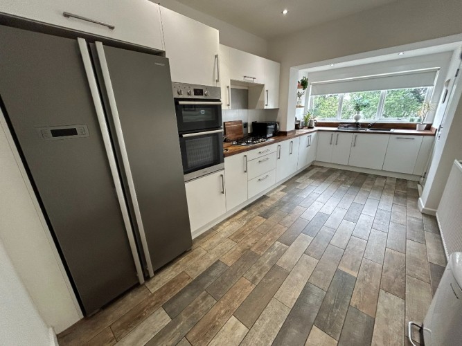 Description: Window Formation with Blind onto Rear Garden, Kitchen comprises of Wall and Base Units with Contrasting Worktop and Tiled Splashback. Sink and Drainer Unit with Mixer Tap. Plumbed for Dishwasher and Washing Machine, Integrated Electric Oven and Gas Hob, Spot Lights and Power Points. Lino Floor Covering, Wall Mounted Radiator, External White UPVC door leads onto Decking area,